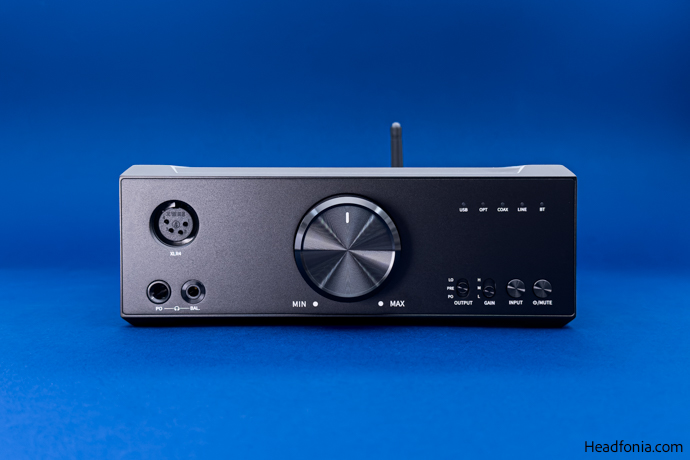 It is color-coded and it provides various info, including power status, pairing status, and active sample rate or file type during playback. There are two switches and two buttons at the bottom right of the front panel. From left to right, there is an output selector, a gain selector, an input selection button, and lastly, a button that doubles as a power and mute button. Long pressing turns the device off whilst pushing it once mutes all sound.