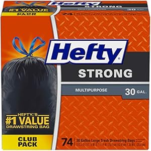 LARGE GARBAGE BAGS: This package contains 74 Hefty Strong large, black, unscented, 30 gallon multipurpose bags