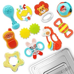 INTEGEAR 10pcs Baby Toys Rattles, Infant Grab Early Educational Learning Toy Set, Sensory Teether Shaker with Storage…
