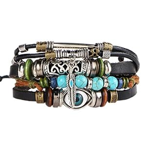 Multilayer Leather Bracelet , Handmade Beaded Bracelet ,Blue Eye Bracelet Vintage Hollow Carved Bracelet (Multicolor)