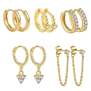 Earrings, Jewelry, Women5 Pairs Huggies Hoop Earrings Set for Women Girls Gold Silver Small Dangle Chain Hoop Earrings Cubic Zirconia…
