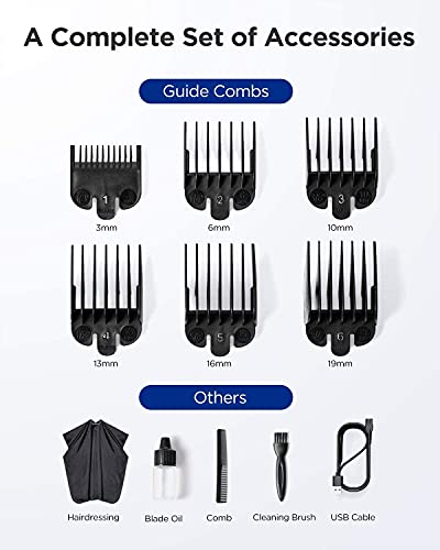 【12 pcs Mens Hair Clippers Grooming Kit】 This is a complete barber sets for cutting hair, which includes a cape, lubricating oil, cleaning brush, and a full-range of guard attachments (3/6/10/13/16/19mm) for different hair lengths (0.5-20.7mm).