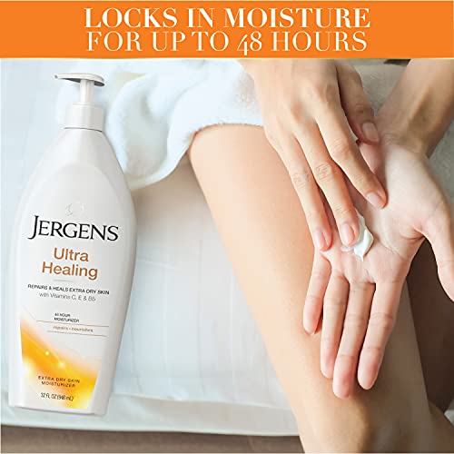 Repair dryness at the source with Jergens Ultra Healing Moisturizer for Extra Dry Skin. The nourishing formula penetrates through five layers of skin to heal extra dry skin, improve tone and texture, and leave it smooth and visibly healthier. The formula absorbs to soften areas that tend to need the most moisture like heels, elbows, and knees. This body moisturizer, with a unique HYDRALUCENCE blend of ingredients plus Vitamins C, E, and B5, leaves your skin luminous and moisturized for up to 48 hours. Jergens hand and body lotion for women and men is carefully formulated for optimal dry skin relief. Jergens hand lotion with pump hydrates and moisturizes dry and cracked hands for extra dry skin relief. Body cream for women and men soothes skin for long lasting hydration. Hand cream for dry cracked hands rejuvenates cracked skin for optimal moisture. Satisfaction Guaranteed. Limitations may apply.