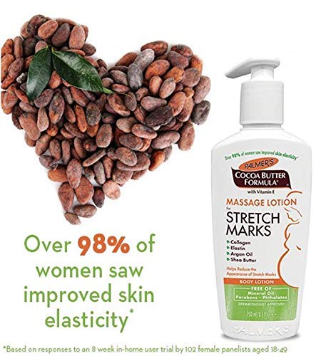Palmer’s Cocoa Butter Formula massage Lotion helps visibly improve skin elasticity and reduce the appearance of stretch marks. Pure cocoa butter and shea butter, natural oils, collagen, elastin, and lutein keep skin moisturized and supple for 48 hours, allowing skin to stretch more easily. Widely recommended for stretch marks during and after pregnancy or weight fluctuation. This non-greasy lotion is ideal for all over body use, in place of your regular moisturizer. Iri infoscan 52 weeks ending 7/19/17 F/D/Mx units based on an 8 week in-home trial by 102 female panelists aged 18 to 49