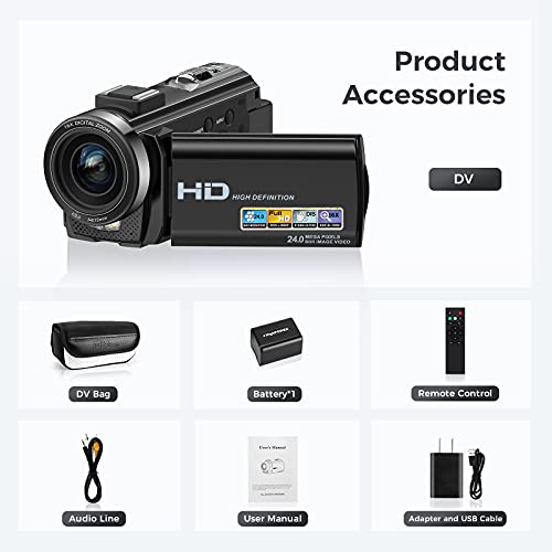 【1080P+3.0-inch IPS screen】 This video camera supports up to 1080P (15FPS) AVI video resolution and 24M (6000×4500) JPEG image resolution. 1920×1080 (15FPS), HD 1280×720 (30FPS), 640×480 (30FPS) video resolution. It has the largest 24.0 megapixel CMOS image sensor. 3.0-inch IPS screen, supports 270° rotation, 16x digital zoom, built-in fill light, anti-shake, face capture, beauty function, Selfie, webcam function, pause function, USB 2.0, TV output, etc.