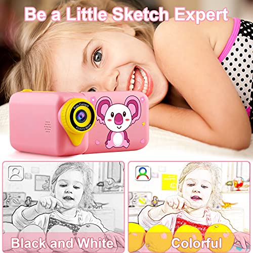 【Sketch Photos and Multifunctional】This kids digital camera can take unique sketch photos. It has 10 funny photo frames, 8 prank special effects and 7 color filters for children to choose from. Built-in 4X digital zoom, continuous shooting and time-lapse shooting, children will enjoy the interesting photo effects they get.