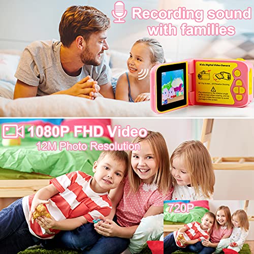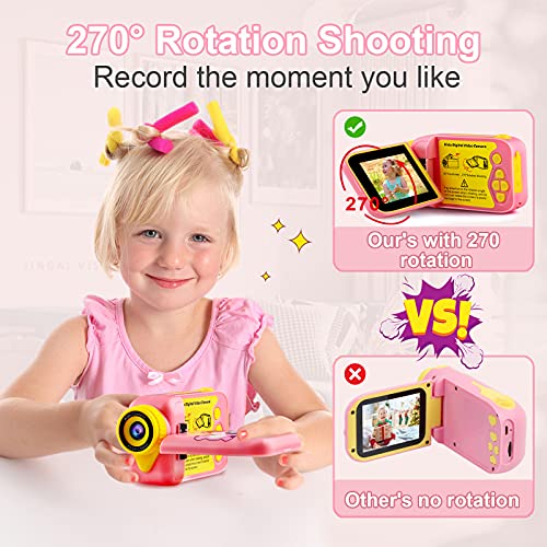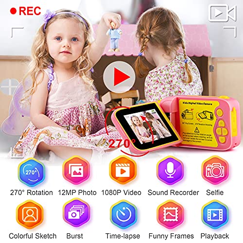【270° Rotatable Kids Video Camera】This kids camera is the 2021 latest design rotatable video recorder, the 2.4-inch display can be rotated in 4 different directions, allowing you to take pictures from various angles. Equipped with 12.0 Mega pixels photo and 1080P HD video. And supports take selfies and record voices.