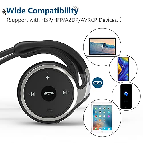 [Bluetooth 5.0 Technology]: The behind head bluetooth headphones is designed with advanced bluetooth chipset, ensuring faster transmission and stable signal connection, it can compatible with all kinds of bluetooth enabled device, such as cell phone, tablet and etc. The bluetooth connection range is about 33ft, gives you handsfree phone call and music experience.