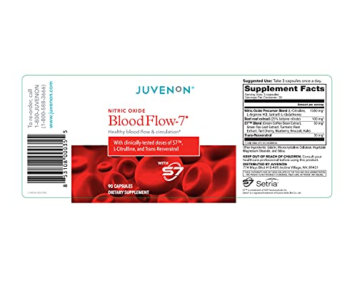 MAINTAINS HEALTHY BLOOD PRESSURE: Juvenon Blow Flow-7 supports varicose veins flow and healthy blood pressure. Optimize strong circulation to maintain healthy organs including your brain, heart, lungs, kidneys, liver and skin, hair, and nails. Juvenon Blood Flow-7 contains green tea leaf extract, which supports increased energy, stamina, and thermogenesis and helps curb appetite. Say goodbye to cold hands and aching legs. Just take 3 capsules once a day.