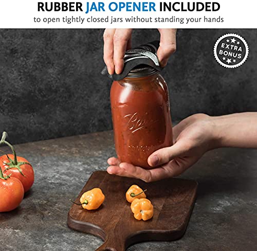 DURABLE GLASS CONSTRUCTION: Made in America soda-lime glass, USDA approved and,Toxin-free ensuring food grade quality. Heat-tempered durability for water bath canning, microwave and dishwasher safe; clear glass jars for easy visibility; wide mouth canning jars for easy filling and washing.