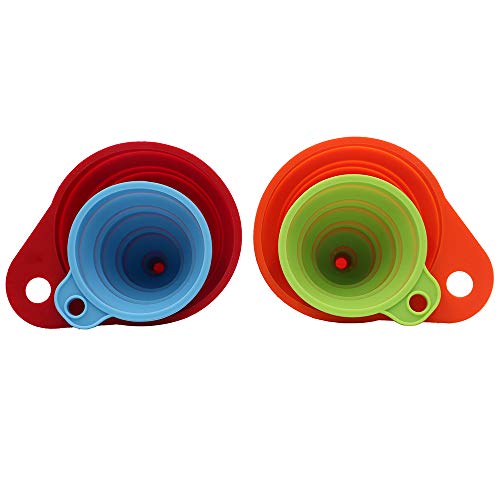 ASSORTED SIZES AND COLORS: 2pcs Large funnel and 2pcs Small funnel in different colors (Red,orange,blue and green). Silicone collapsible funnel large and mini versions, a must kitchen tool accessories for mom!