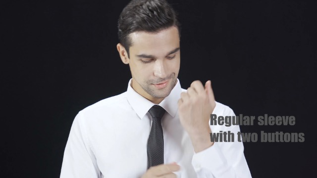 Regular sleeve type, two buttons, can adjust cuff tightness according to wrist thickness.