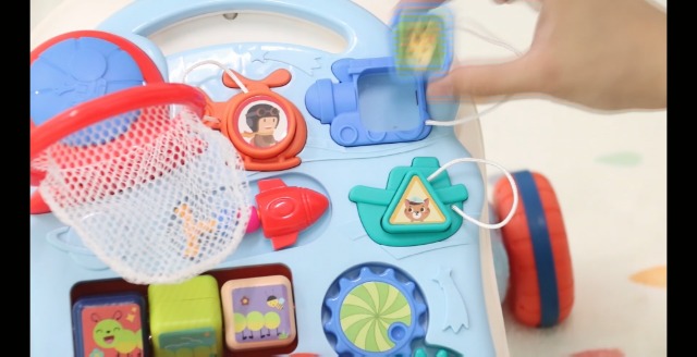 [Baby Entertainment Table]: Kids activity center table with turning cube, shape recognition block, colorful turnable gear, small beads, detachable basketball frame and elephant shaped piano. This funny panel can exercise babies’ hand-eye coordination and sense of rhythm, while cultivating their cognition.