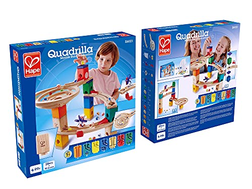 Corporate History Hape Holding AG was established in Germany in 1986 by Peter Handstein. Today Hape is a renowned high-end toy designer, manufacturer and distributor with offices located in Germany, Switzerland, Italy, France, United Kingdom, Spain, North America, Netherlands, Mainland China and Hong Kong. As of January 2021, Hape has over 30 subsidiaries and investment affiliates positioned around the globe. Product Description The Race to the Finish is designed as a beginner’s set. Drop two marbles into the top and watch as they race down different paths to the bottom. It provides endless creative building possibilities and encourages spatial thinking and problem solving. Each of the seven different color blocks has a different function, and it’s the world’s only kinetic marble run. All Quadrilla marble run sets are crafted with heirloom quality birch and rubber wood for long-lasting marble racing fun. Every Quadrilla marble run is different and provides a combination of a great mix of spins, drops, seesaws, and speed that will have marbles going every which way! As with every Hape Quadrilla Marble Run Construction Sets, it combines easily with other Hape Quadrilla products for expansion and unique combinations that will enhance your child’s play experience. Specifications Package Dimensions: 14.17 x 13.78 x 3.15 inches, 3.52 pounds Recommended Age: 4Y and Up Material and Finishes Durable child safe paint finishes, and solid wood construction make this a toy your child will love for years to come. Hape products are made almost exclusively from wood and natural products which are sourced form sustainably harvested forests. All Hape products sold in North America meet or exceed all applicable safety standards. Wooden Toy Maintenance Method The surface of the product is made of safe and water-based paint, which does not need to be disinfected. It can be dissolved in water. Do not use alcohol to wipe, do not wash, just wipe gently with a dry and wet cloth!