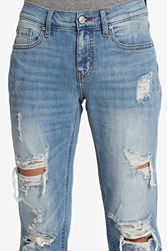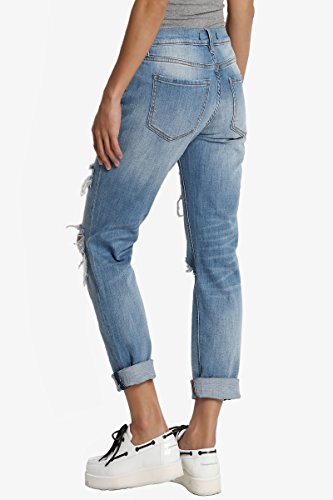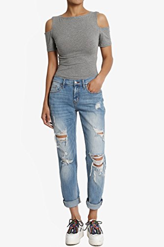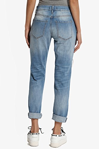 Medium indigo wash with fading and whiskering, distressing relaxed boyfriend jeans, Mid rise; straight fit through hips and thighs; straight leg