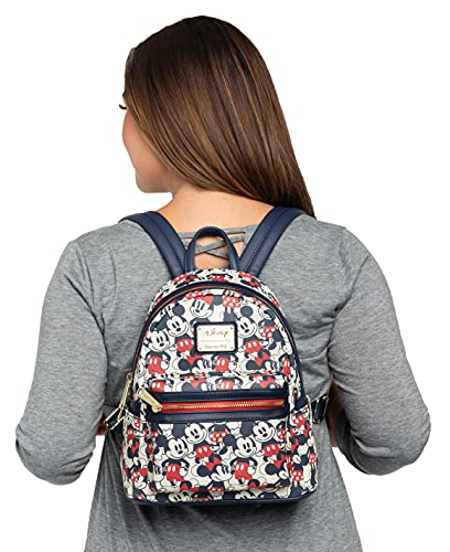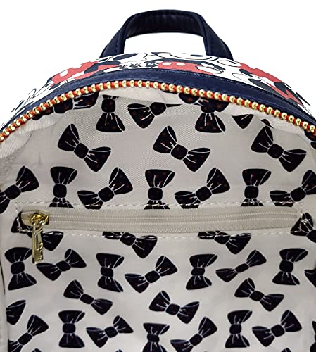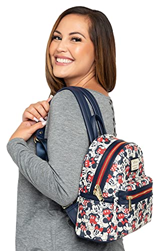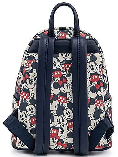 Loungefly Disney Mini Backpack with Mickey & Minnie Mouse all over print – officially licensed. It is faux leather with print lining. Main compartment opens with a double zipper. There is a front zip pouch pocket and an interior zip pocket. Each side has a small slot pocket. Adjustable shoulder straps and top handle are faux leather. This is a MINI backpack – approximate measurements: 9″ x 10″ x 4.5″. This item is not intended for use by children 12 and under.