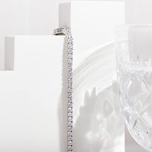 Tennis bracelet featuring round 3mm AAA+ cubic zirconia stones in four-prong basket settings. Measures 6.5 inches in Length