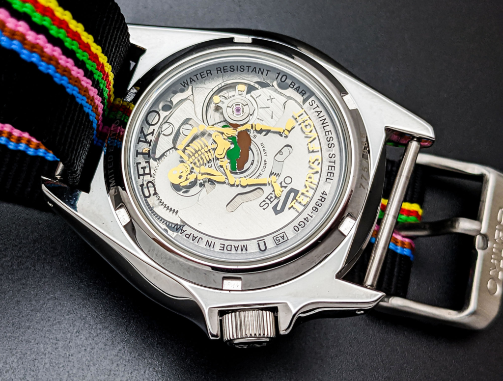 The slim, smooth bezel stainless steel case design used by the Rowing Blazers x Seiko 5 Sports series is markedly smaller than the more familiar “SKX” diver-style case used by most 5 Sports models, measuring in at a modest 40mm-wide and 12mm-thick. Like so many Seiko designs, the numbers here can be misleading, thanks in large part to inwardly sloping polished case sides and short curving lugs. In practice, the Rowing Blazers x Seiko 5 Sports line feels old-school compact on the wrist, with a simple and lightweight feel that make them an appealing option for daily wear. Unlike the larger iterations of the Seiko 5 Sports family, these models use a chamfered polished bezel design for a more refined, less purpose-built look than their diver-inspired stablemates. Rowing Blazers adds its own unique touch to the familiar Seiko design with an engraved crown featuring the brand’s “R.B.” initials in ornate Gothic script. Around back, Seiko tops the familiar Hardlex mineral glass display caseback with a printed rendition of the playful Rowing Blazers skeleton emblem, complete with printed “Tempus Fugit” text. It’s a classic memento mori and a reflection of Rowing Blazers’ ethos of not taking itself too seriously. Like the rest of the Seiko 5 Sports line, each model in the Rowing Blazers x Seiko 5 Sports series offers a solid 100 meters of water resistance.